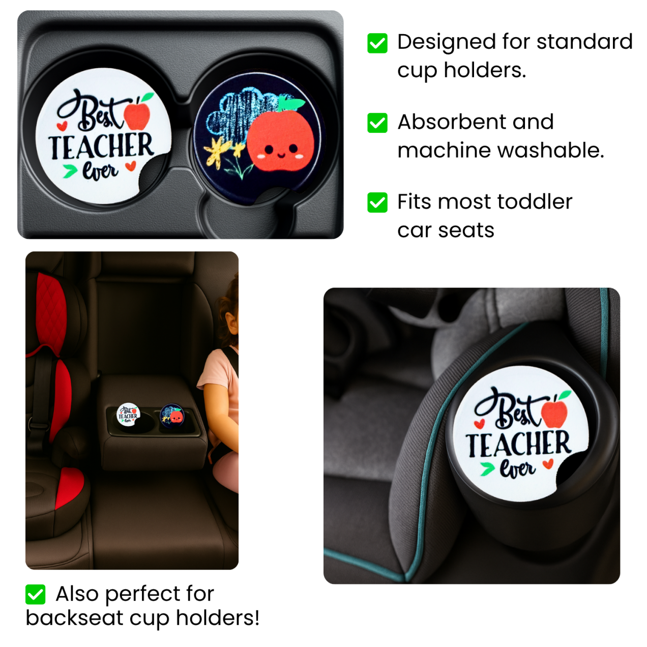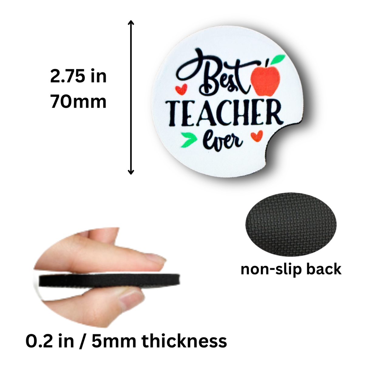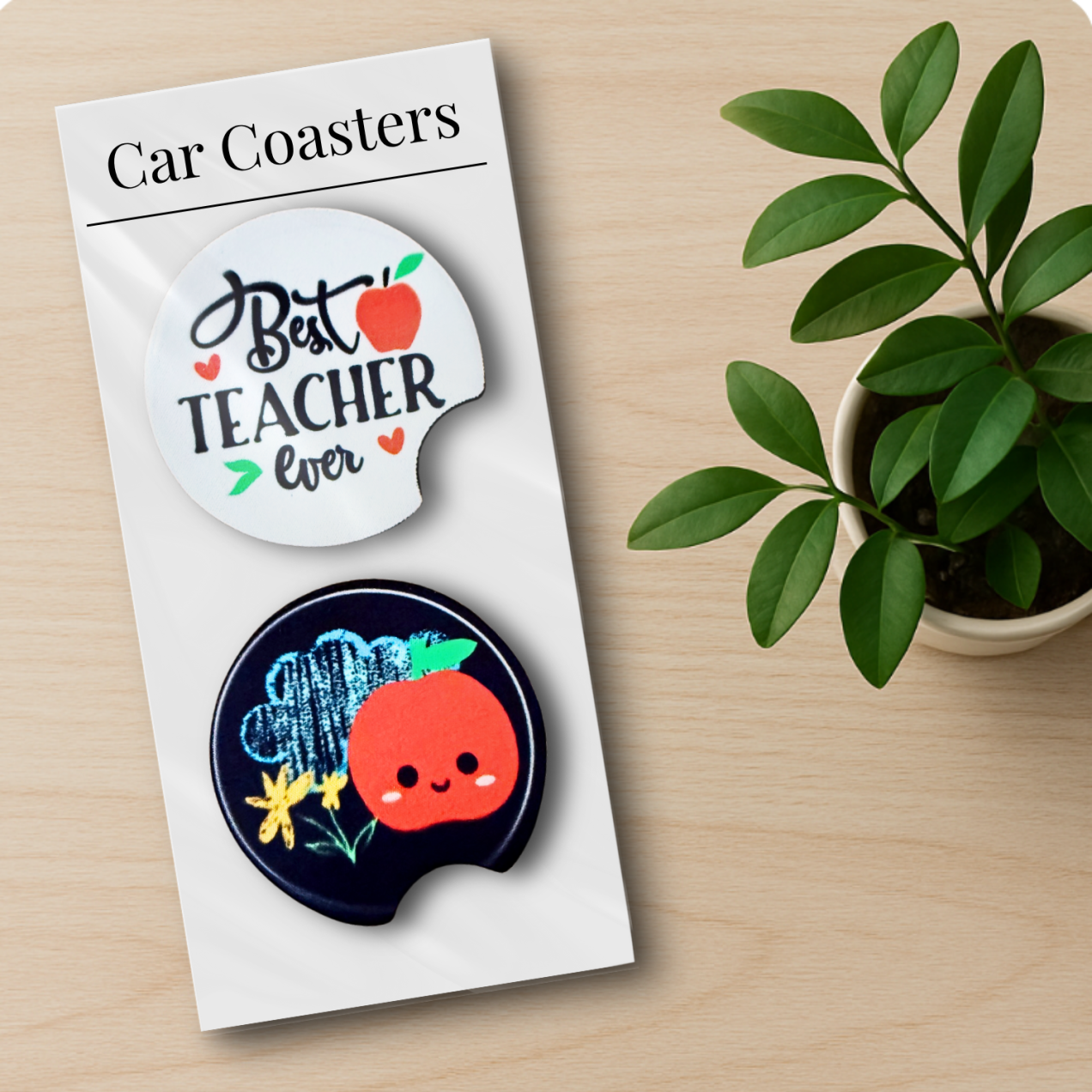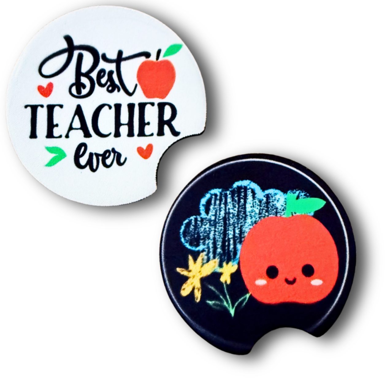 Show your appreciation with this adorable Best Teacher Ever car coaster set! Each set includes two neoprene coasters—one featuring a classic “Best Teacher Ever” design with red apples and hearts, and the other showcasing a cute smiling apple on a chalkboard-style background. Perfect for brightening a teacher’s car while keeping cup holders clean and dry.