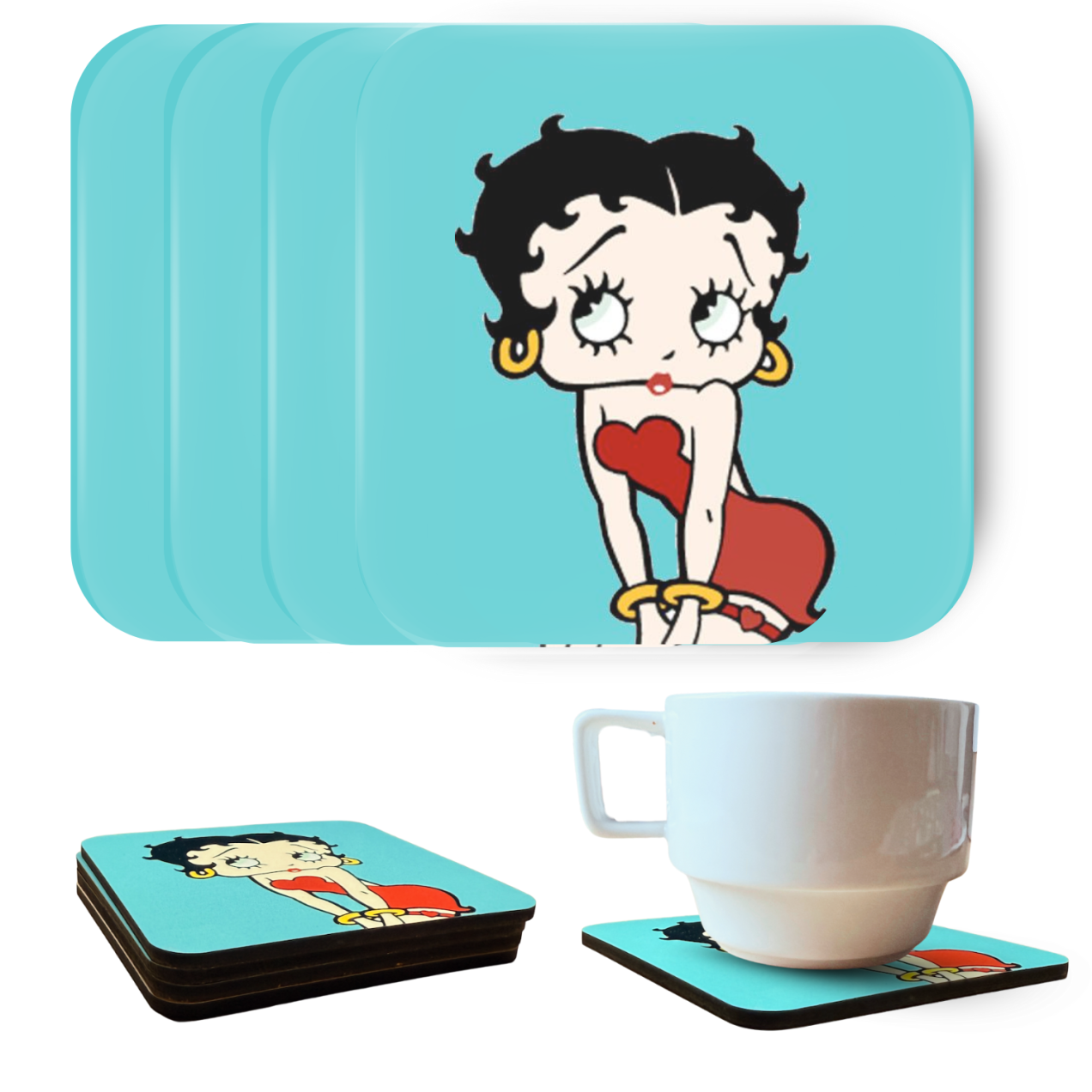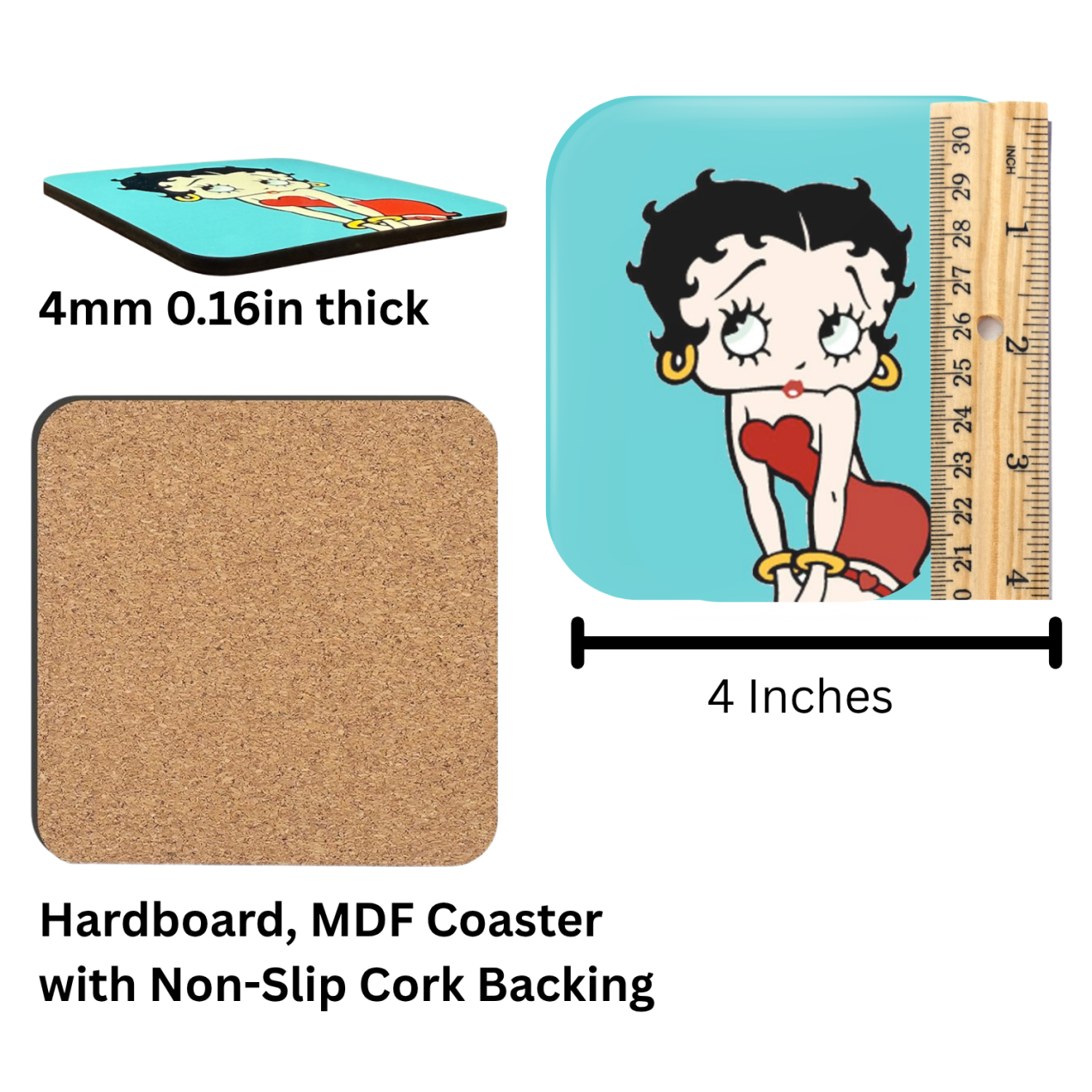 Brighten your space with this set of 4 Betty Boop drink coasters featuring the iconic cartoon star in her classic red dress on a bold aqua background. A perfect mix of playful charm and vintage style for any fan or collector.