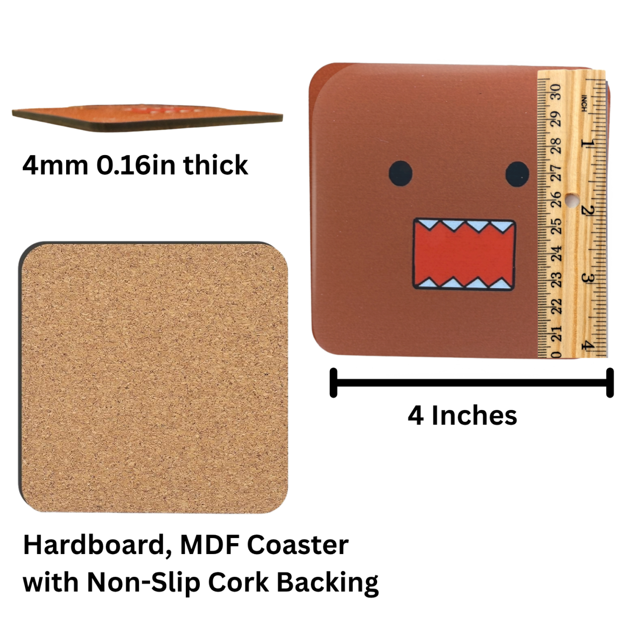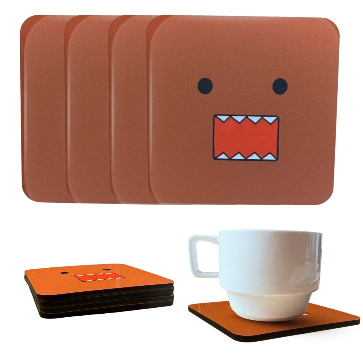 Bring a touch of fun to your coffee table with this set of 4 brown Domo drink coasters, featuring the iconic wide-mouthed Domo face in a clean, modern design. Perfect for fans of cute collectibles or minimalist décor with personality.