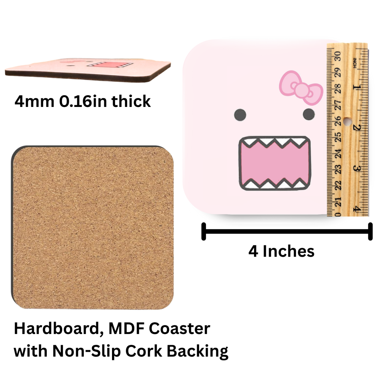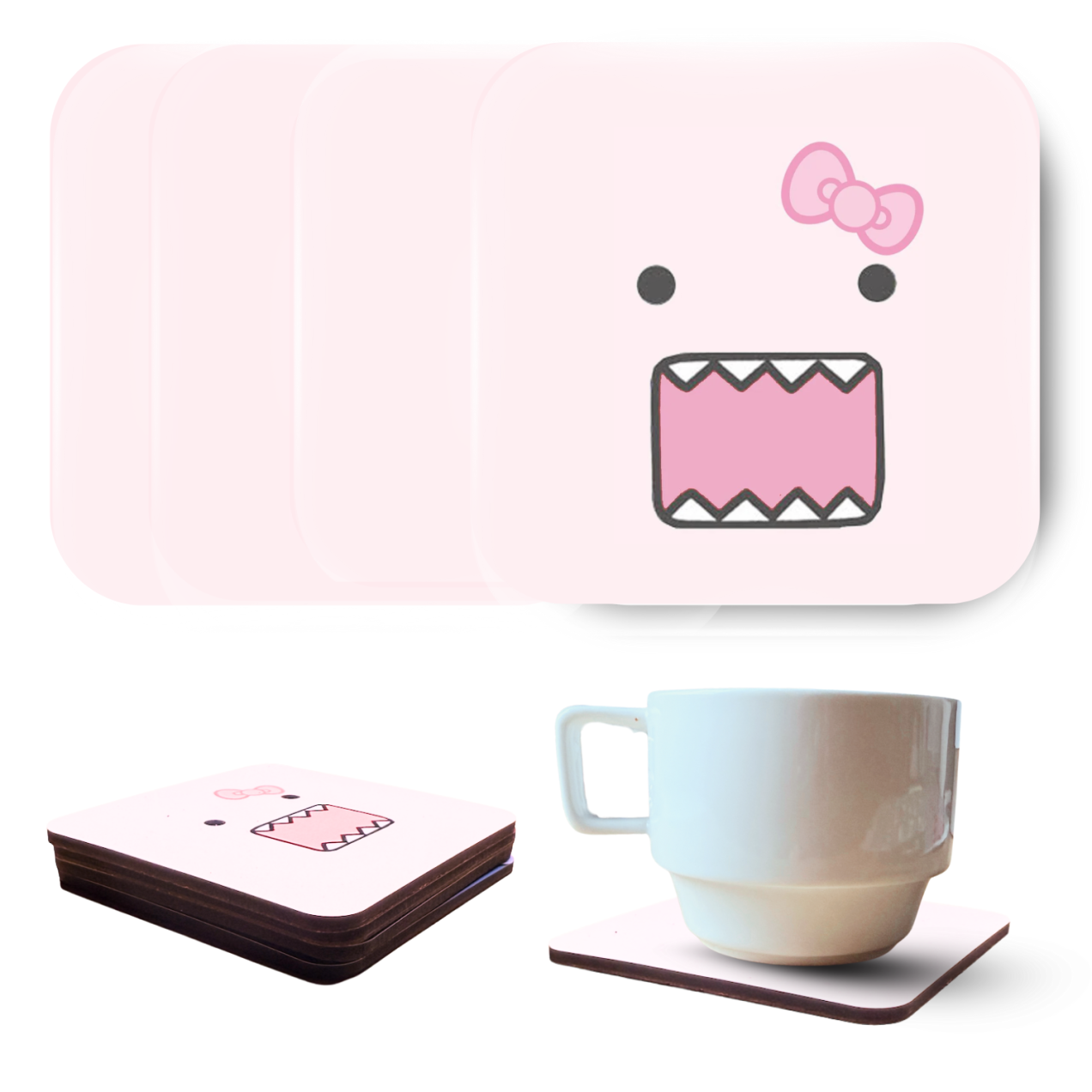 Add a playful pop to your table with this set of 4 pink Domo drink coasters, featuring a kawaii-style open-mouthed face with a sweet pink bow. Perfect for fans of fun, quirky designs that bring smiles to coffee breaks and cozy nights in.