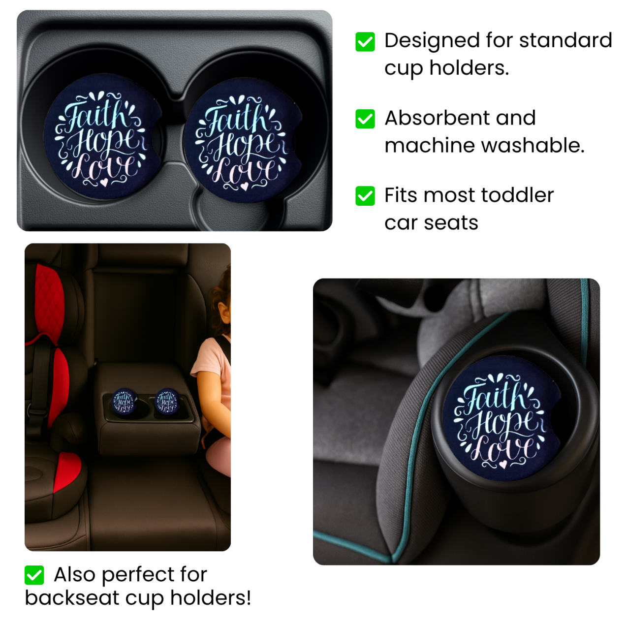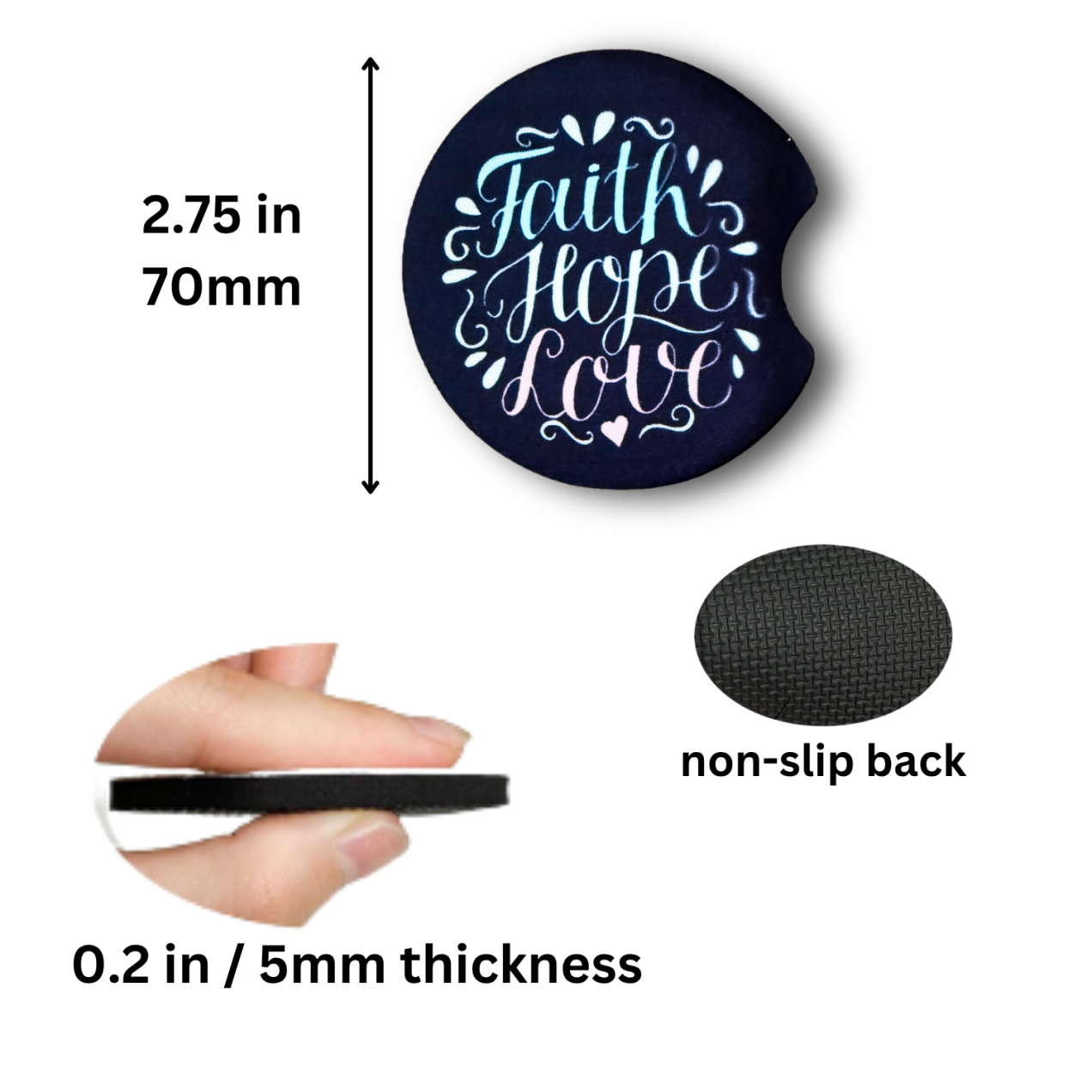 Keep your cup holder clean while spreading inspiration with this “Faith Hope Love” car coaster. Set against a deep navy background, the soft pastel lettering and heart accents create a beautiful reminder of what matters most. Made from absorbent neoprene, it protects against drips and spills while adding a touch of faith to your drive.