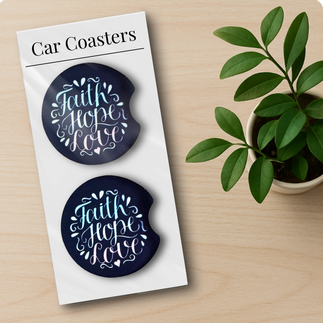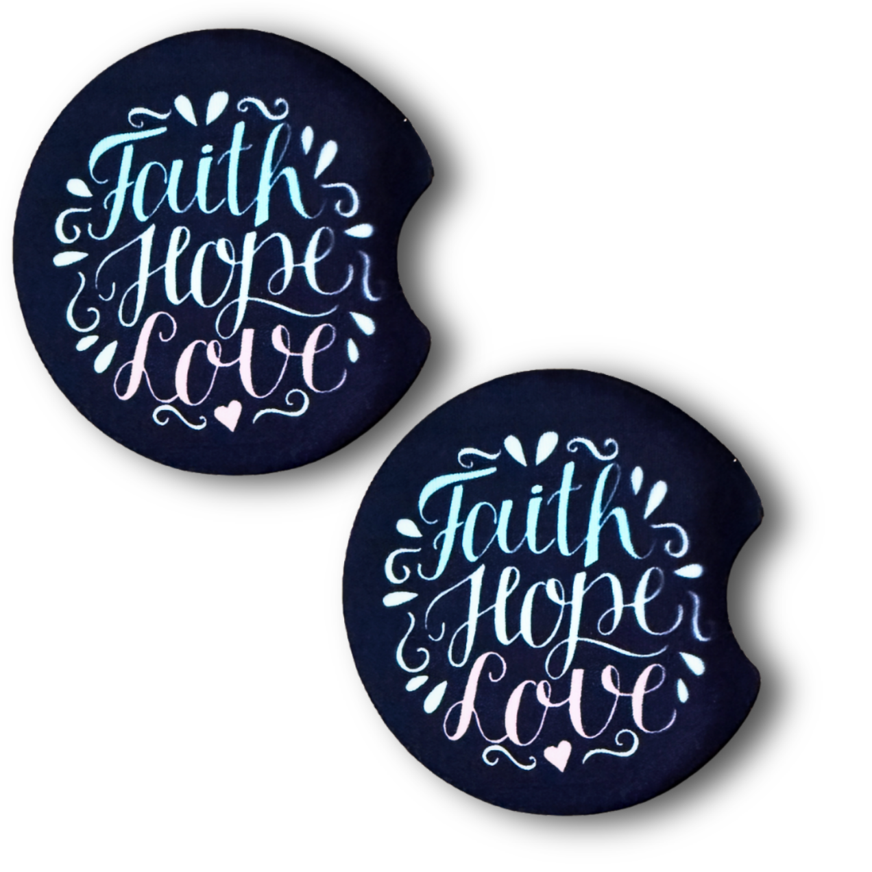 Faith Hope Love Christian Car Coasters – set of 2 black