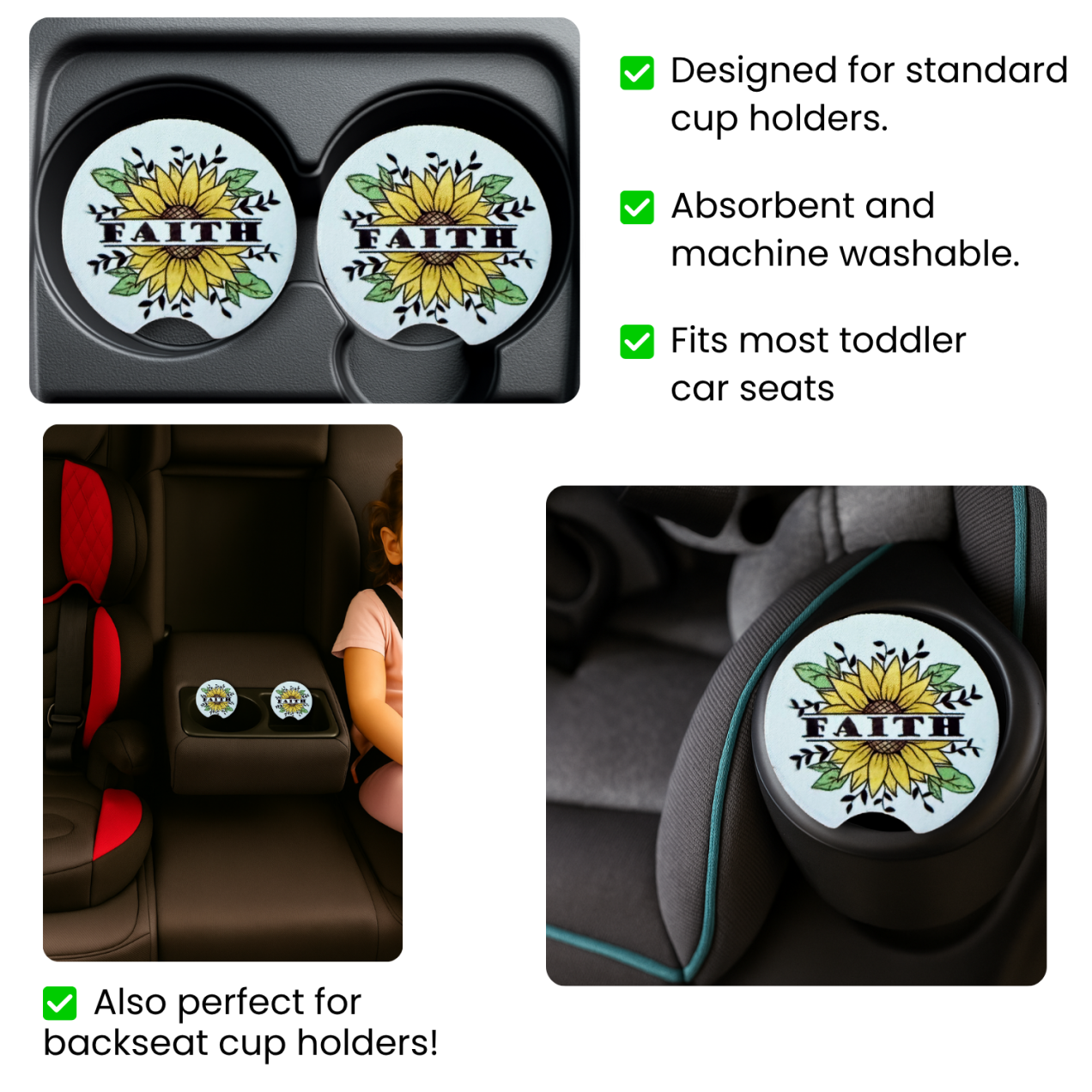 Brighten your car with this inspiring Faith Sunflower car coaster. The design features a bold sunflower with soft green leaves and the word “FAITH” across the center, symbolizing hope and strength. Made from absorbent neoprene, it helps keep your cup holders clean and dry while adding a touch of natural beauty and encouragement.