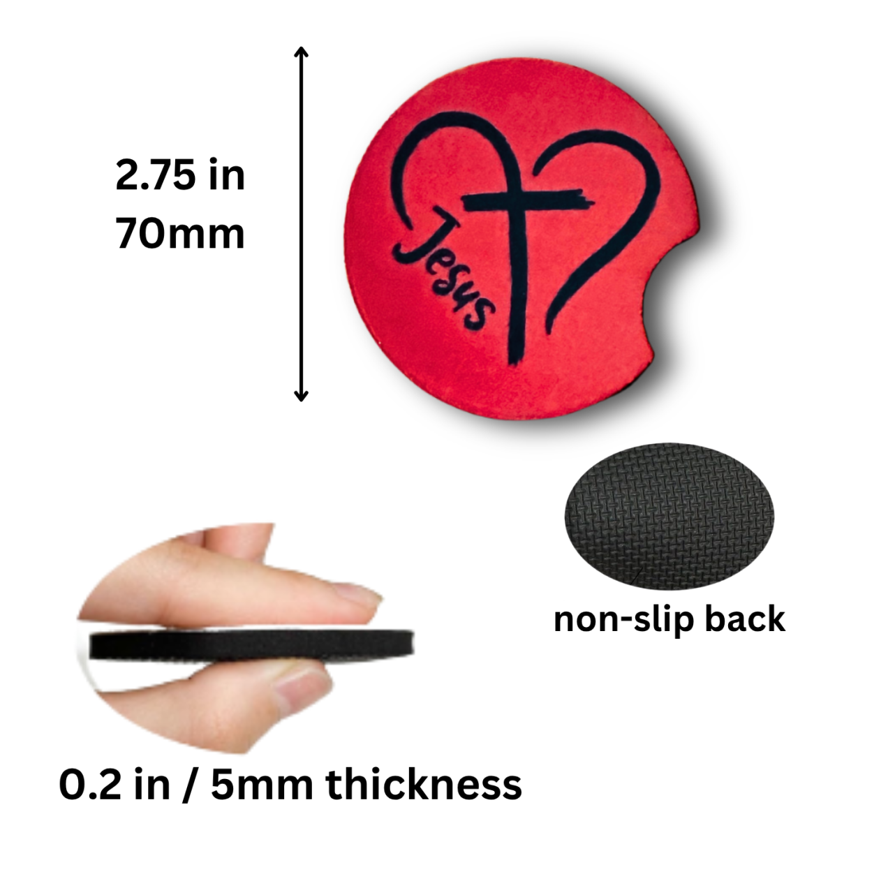Share your faith wherever you go with this Jesus Heart Cross car coaster. The design features a navy blue cross forming the shape of a heart with the word “Jesus” written alongside, all set against a warm red background. Made from absorbent neoprene, it helps keep your car’s cup holders clean and dry while adding a meaningful touch.