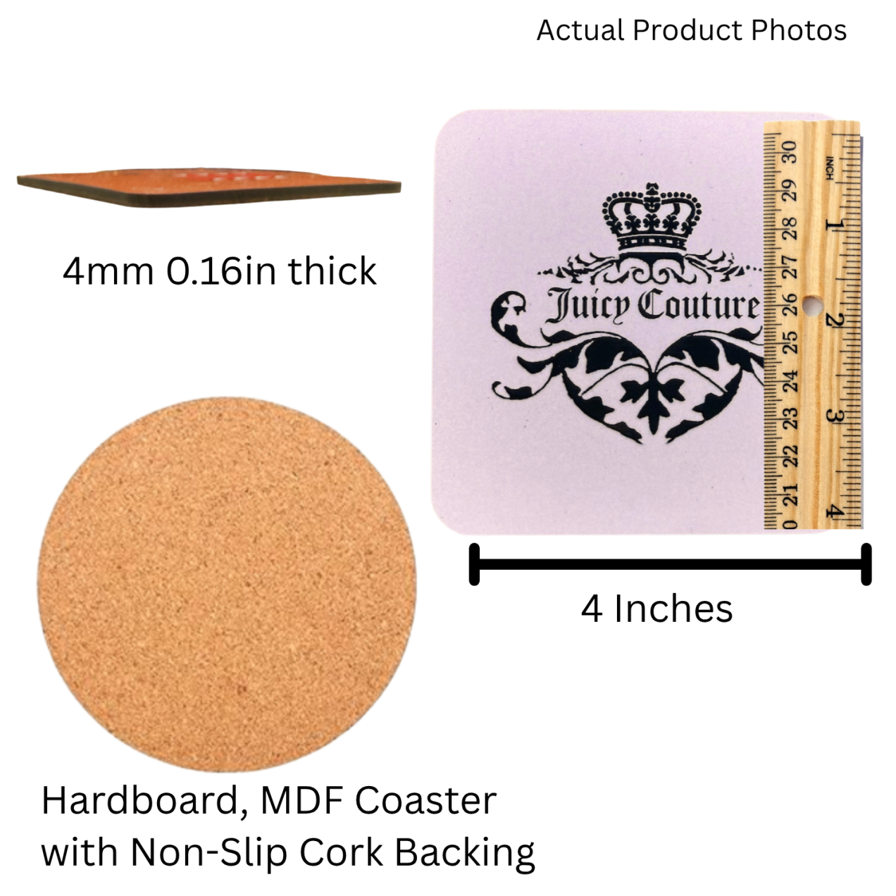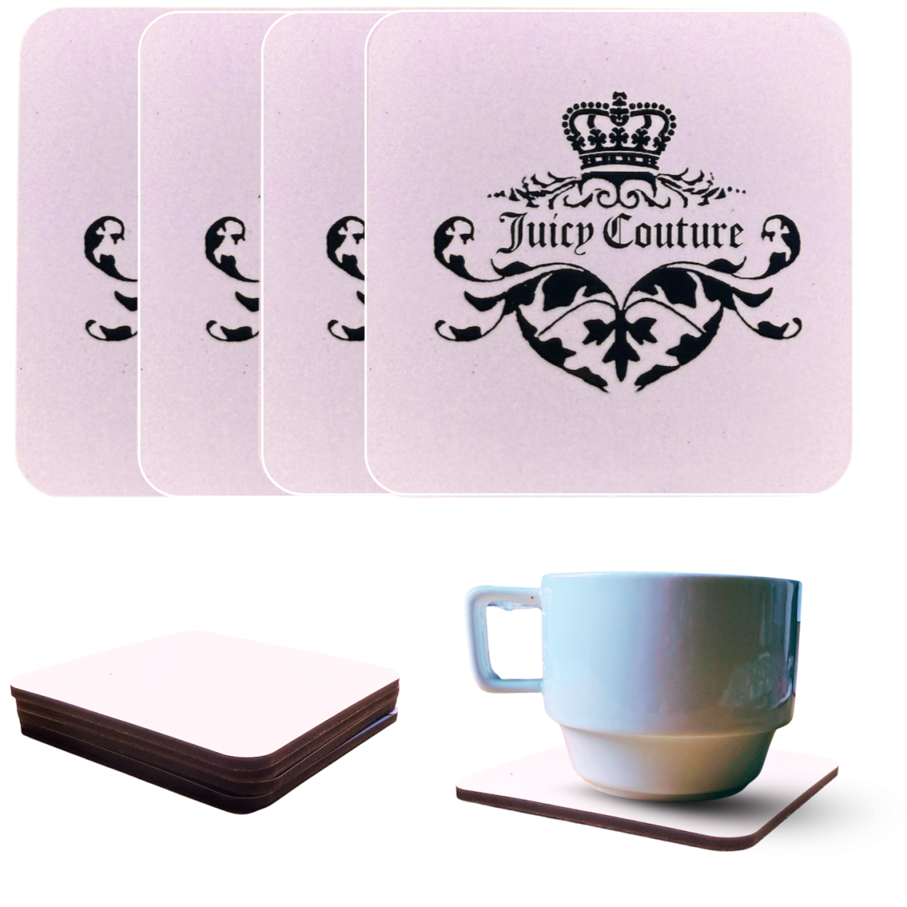 Elevate your space with this set of 4 Juicy Couture drink coasters, featuring the signature crown and heart crest logo in elegant black on a soft pink background. A perfect blend of glam and sophistication for any fashion lover’s home.