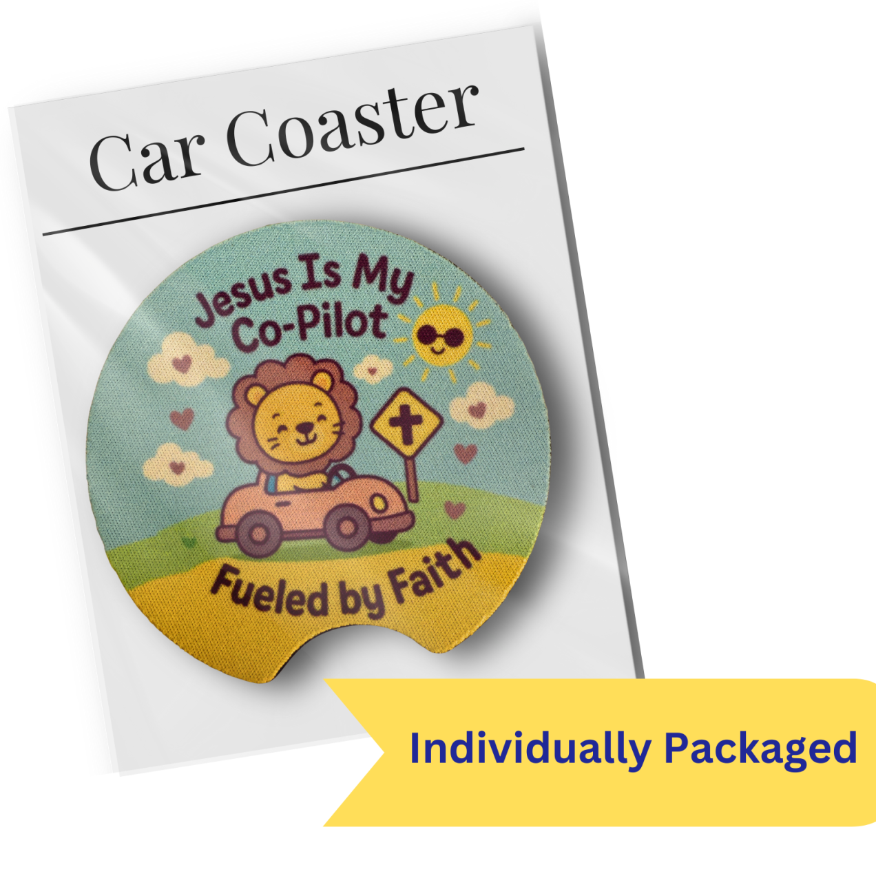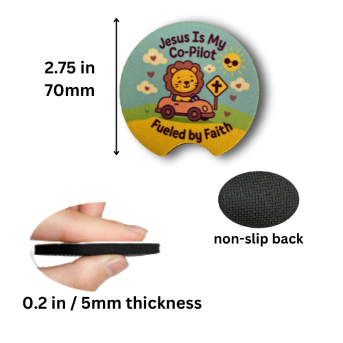 Make your event extra special with these adorable Lion themed “Jesus Is My Co-Pilot – Fueled by Faith” car coasters. Featuring a cheerful lion driving a car with uplifting Christian messages, they’re perfect for birthdays, Sunday school, church groups, or school celebrations.