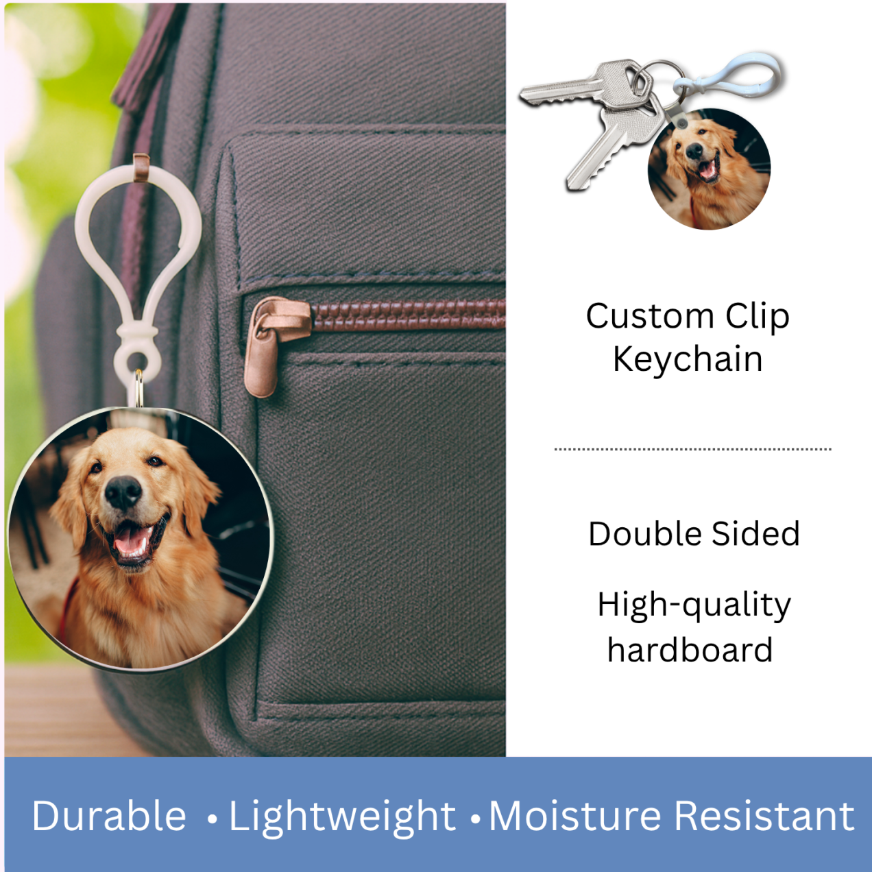 Carry your favorite photo everywhere—or give a heartfelt, personalized gift that’s both meaningful and practical. This custom clip keychain is perfect for keys, backpacks, or bags. Made from high-quality hardboard, it’s durable, lightweight, and moisture-resistant. Choose a double-sided photo or add a custom message on the back for a unique keepsake that looks great and goes everywhere.