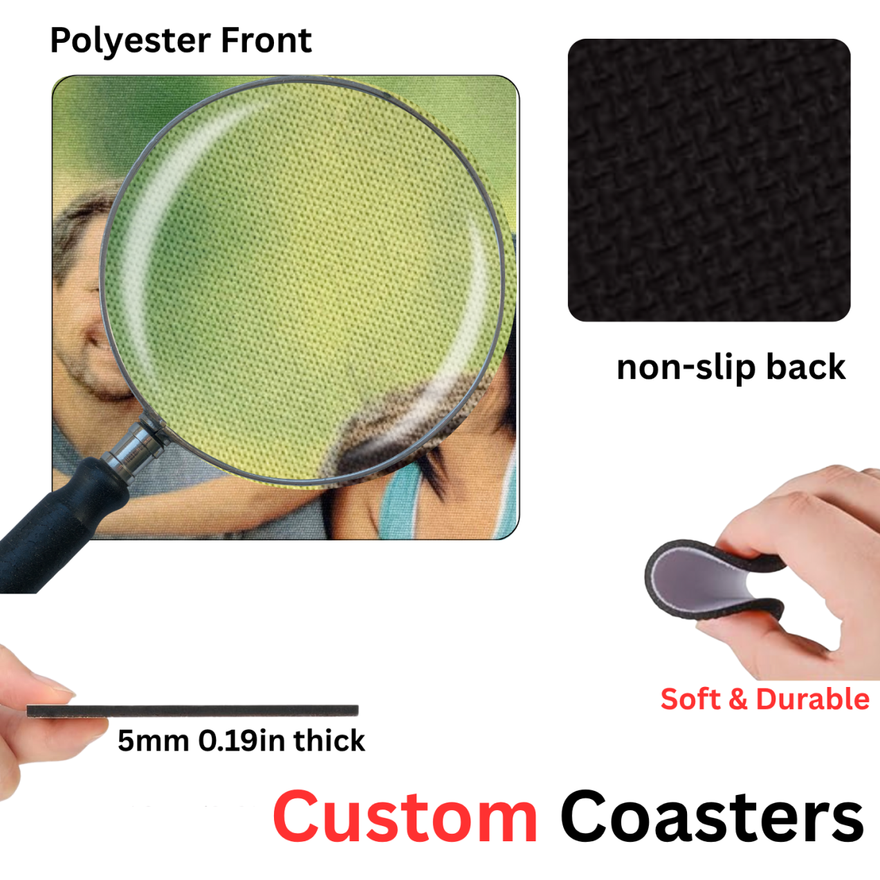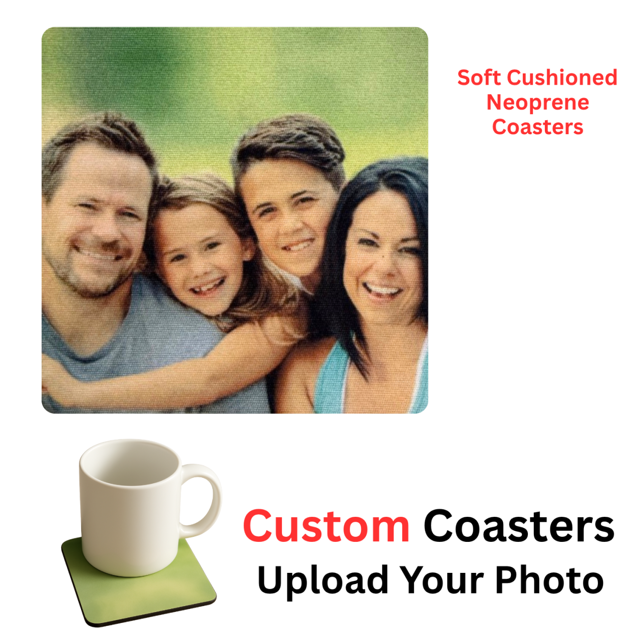 Add a personal touch to your table with these custom photo coasters, perfect for protecting surfaces while showing off your favorite memories. Each coaster features a smooth polyester top for vivid, lasting images and a non-slip neoprene back that stays firmly in place. Soft, flexible, and easy to clean, they’re great for everyday use or as heartfelt personalized gifts.