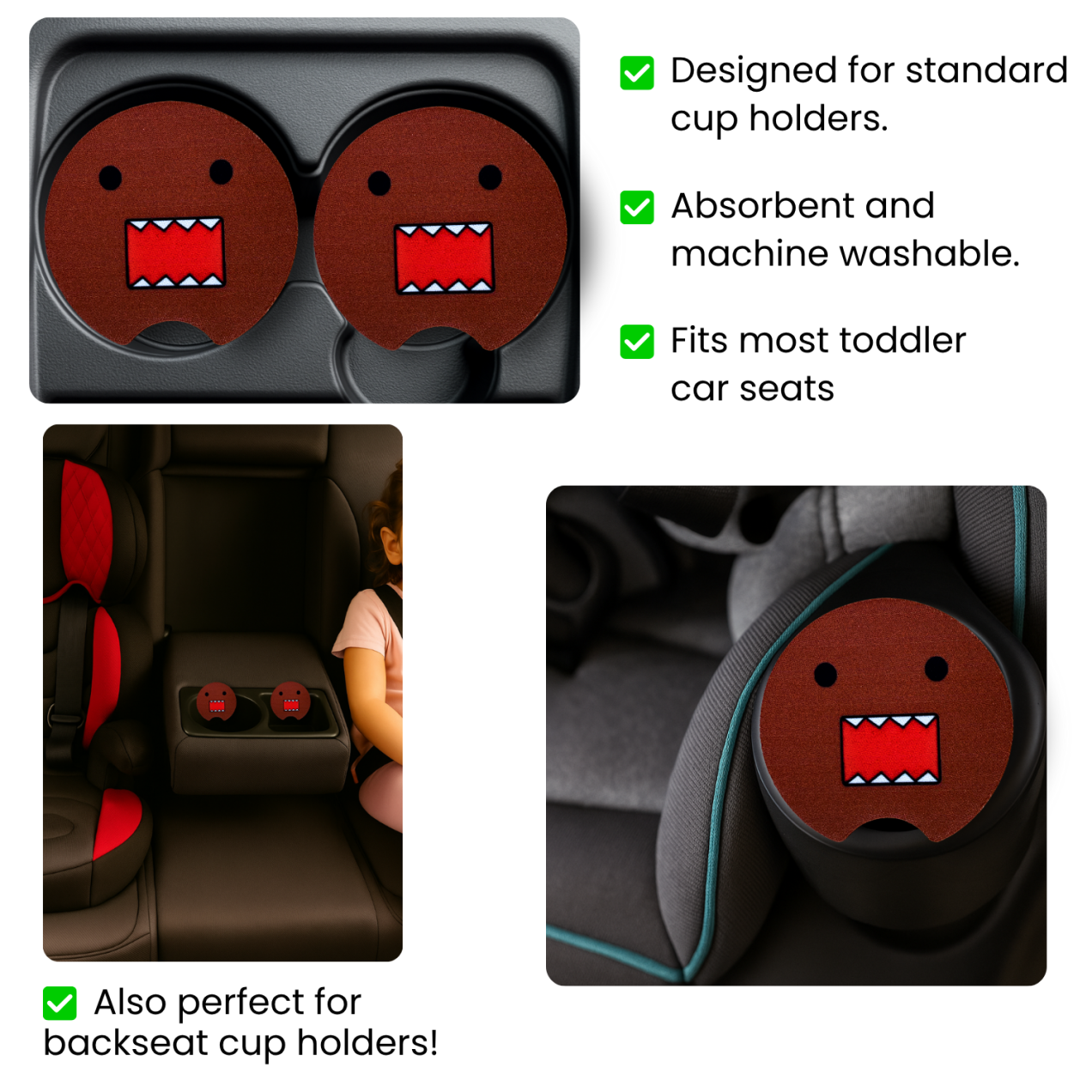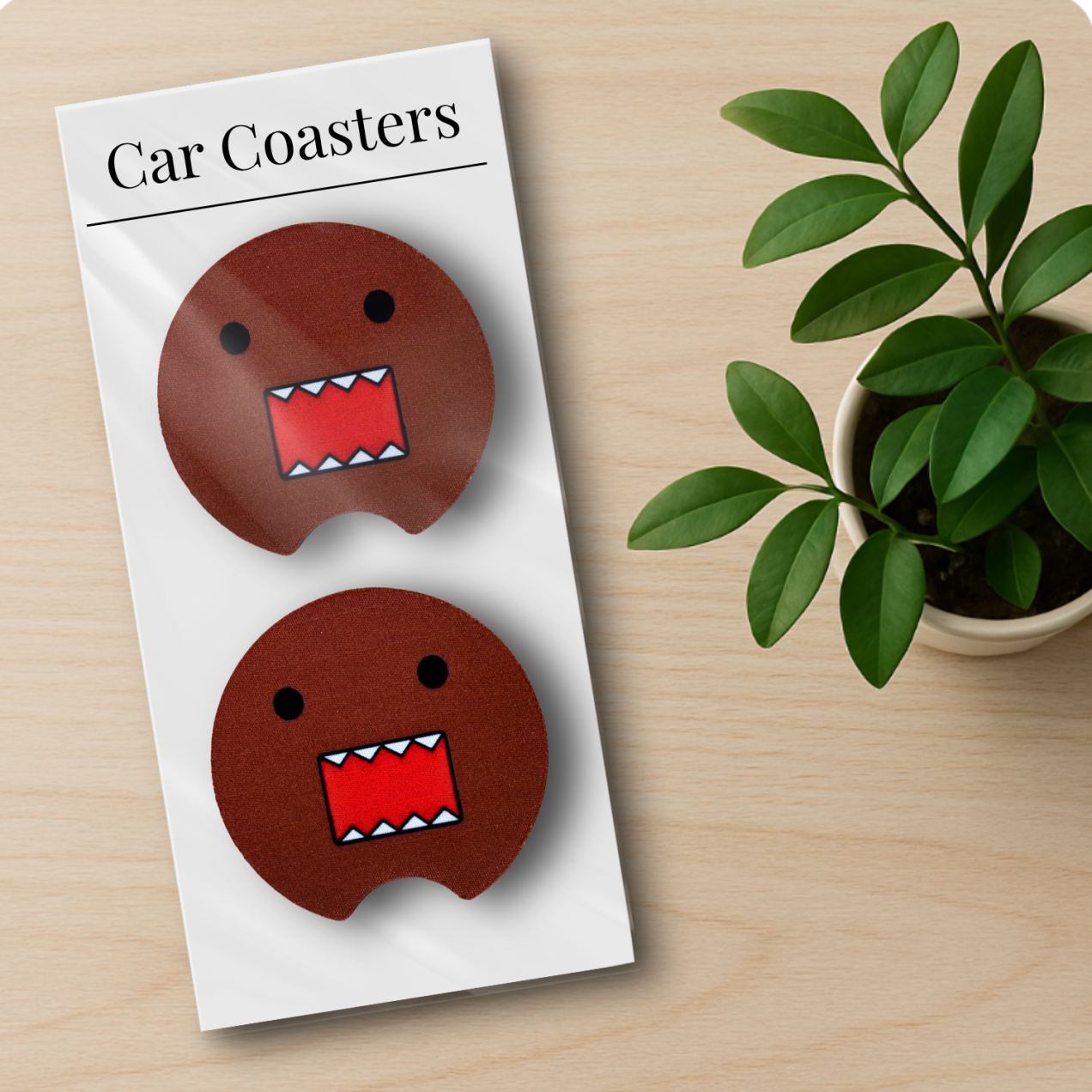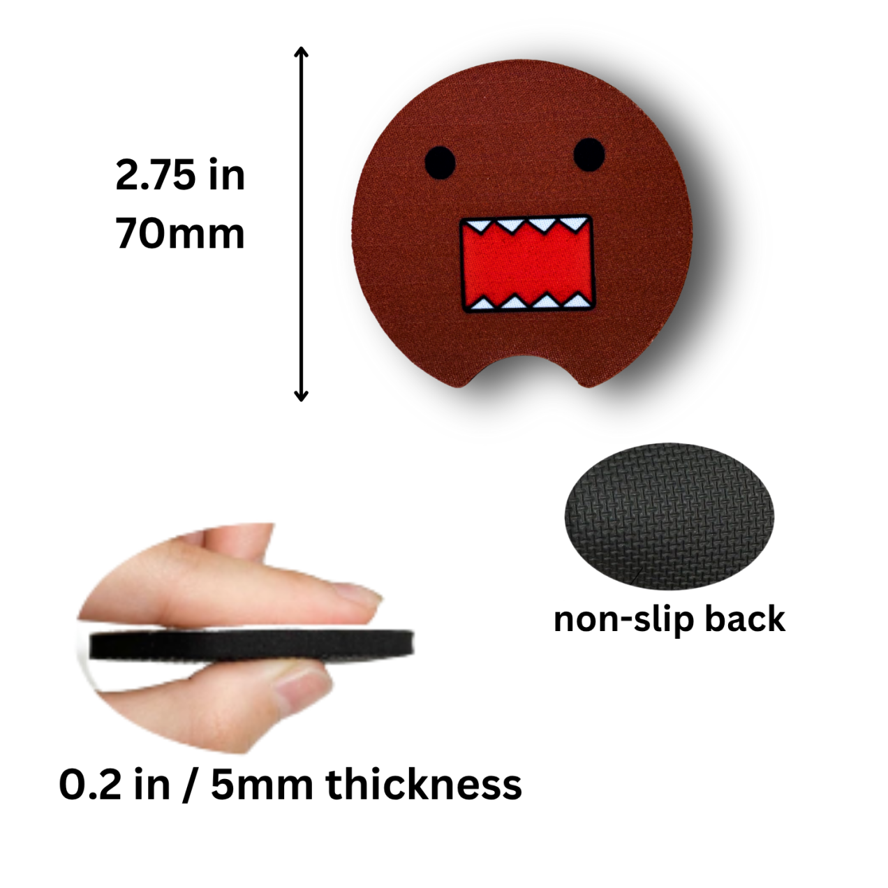 Give your car a retro upgrade with this set of 2 Domo face car coasters! Featuring the iconic open-mouth design in bold red and brown tones, these coasters capture the nostalgic charm of a classic pop culture favorite. Crafted from neoprene rubber with a smooth polyester top, they absorb moisture and protect your cup holders from spills and condensation.