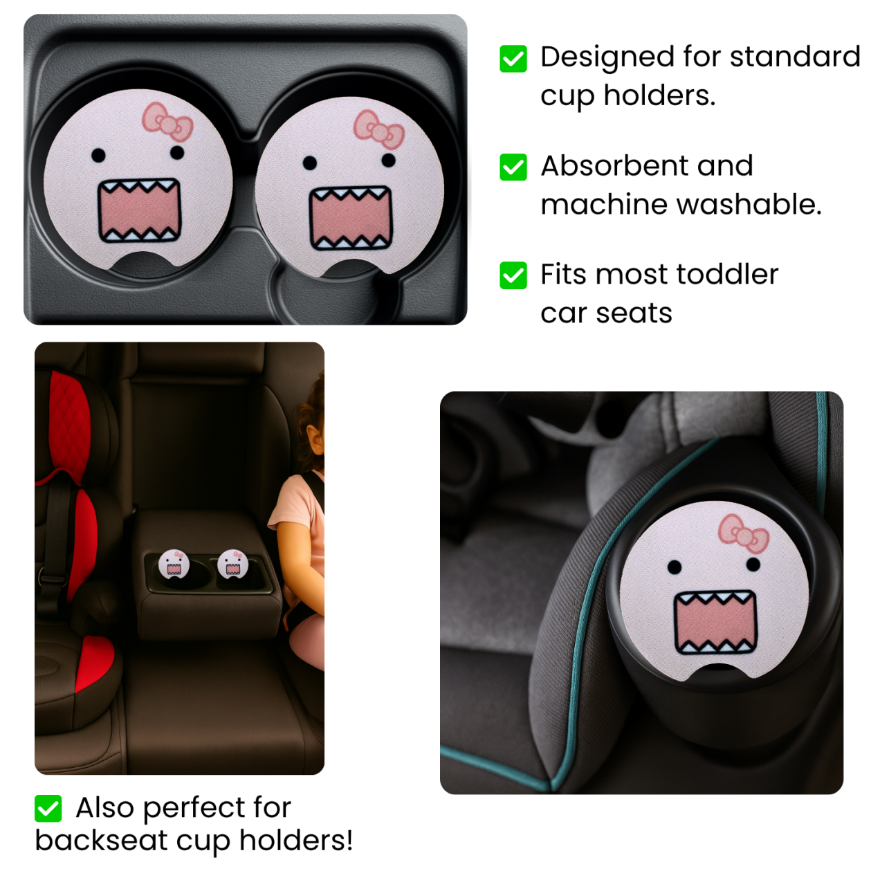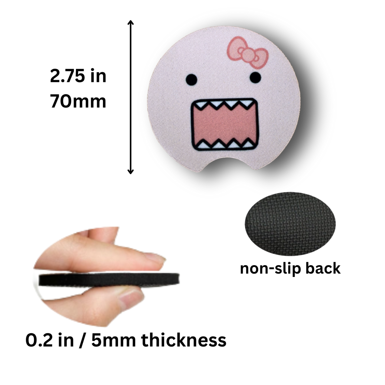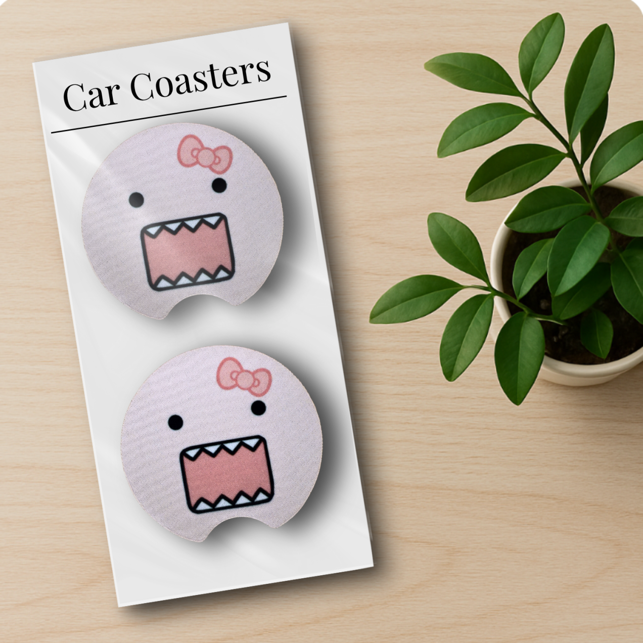 Add a retro touch to your car with this fun set of 2 Domo car coasters! Featuring a nostalgic character design with a pink background and classic expression, these absorbent coasters combine function and vintage style. Made from neoprene rubber with a soft polyester top, they protect your cup holders from moisture and spills while adding a playful throwback vibe.